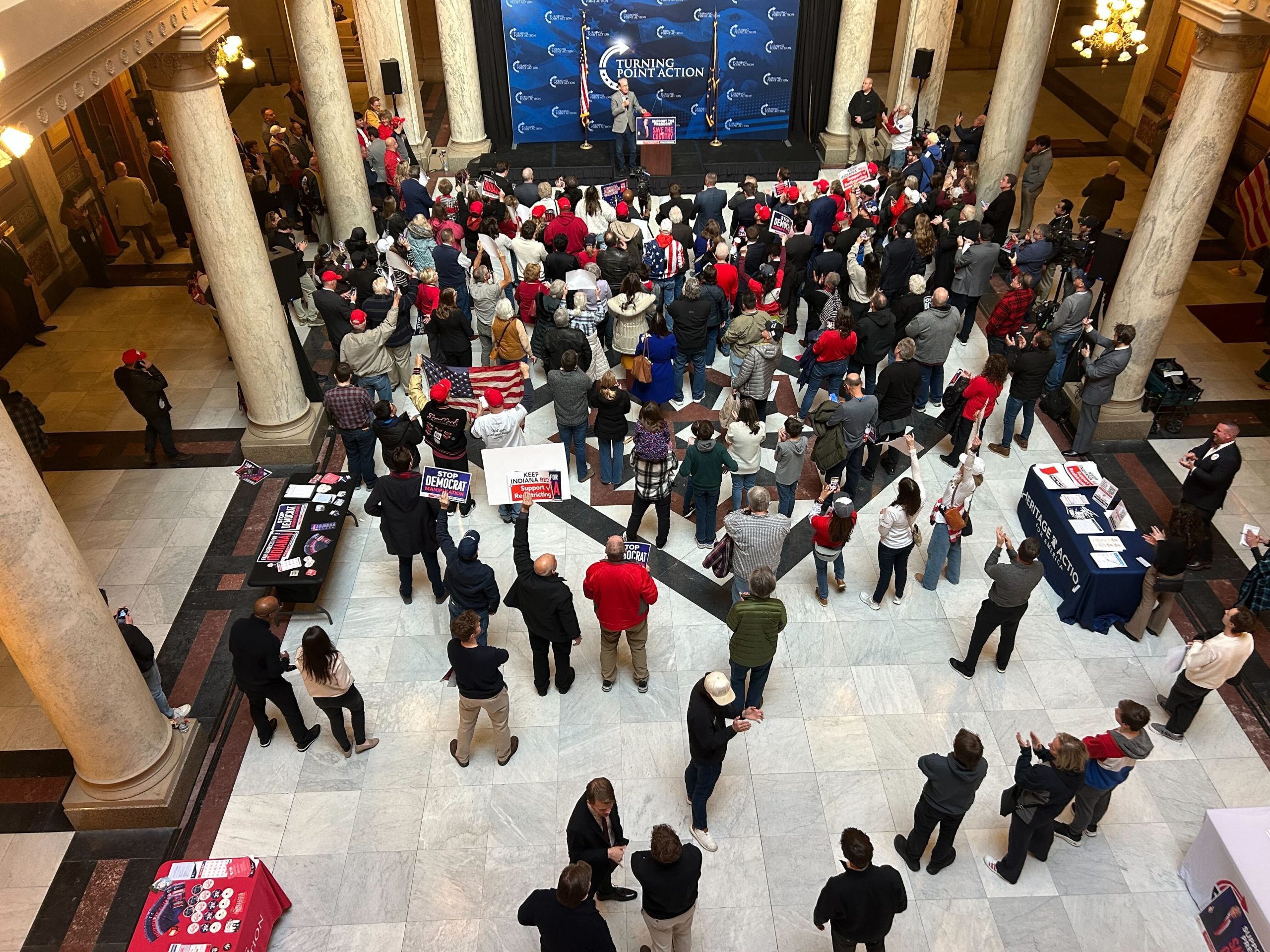 In the state Capitol, as members of the state House debated final passage of a map supporters argue would all but guarantee an entirely Republican congressional delegation — from the current 7-2 split favoring the GOP — Turning Point USA held a sparsely attended rally to pressure Indiana Senate Republicans to do the same, over chants of “9-0.”